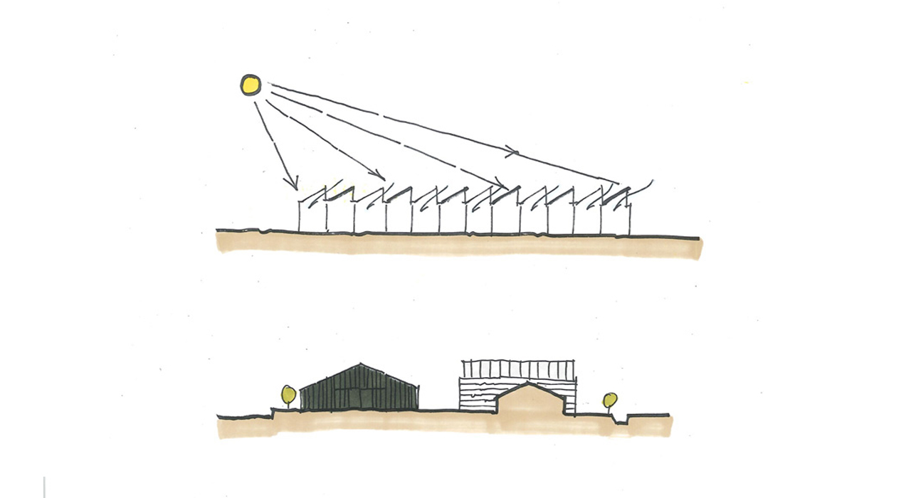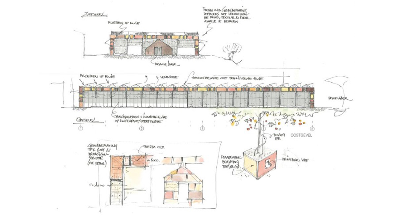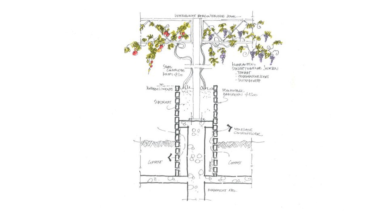 The cow-garden was inspired by FBW’s work in Africa, where nature is respected and integrated in the design and buildings. The green enters the building and around the columns nitrogen fixating plants such as nasturtiums and tomatoes are growing creating shadowy places under the transparent roof.
