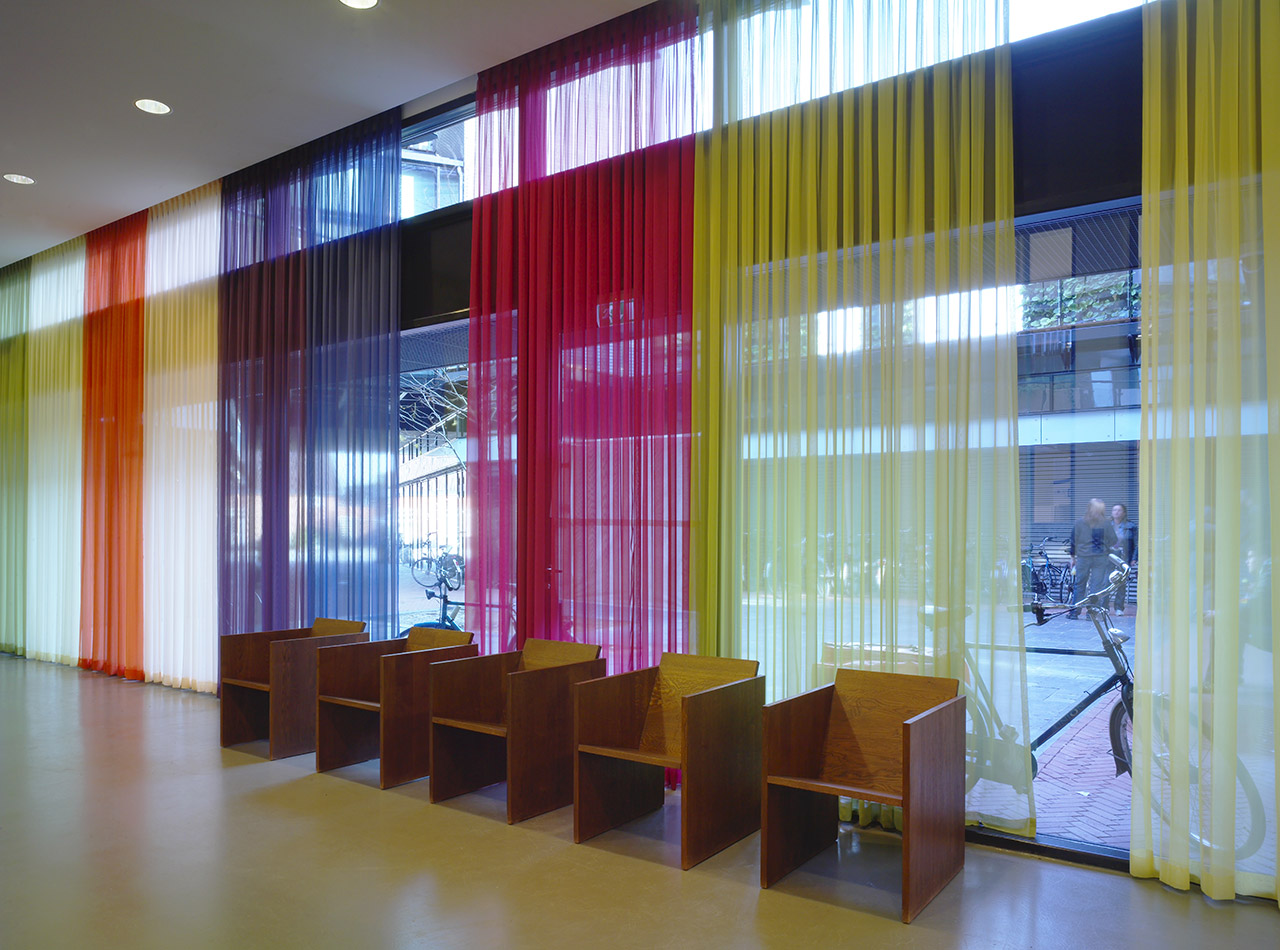 In the centre of the complex a huge entrance hall opens up to the exterior. On the first floor around the void of the hall a roofgarden is projected, at which a Grand Cafe is situated. The 100 beds in their different size dormitories occupy the second to the fourth floor of the building and are grouped around an open courtyard. The courtyard is adorned with a variety of plants. The street elevations are characterised by a rythm of cheerful coloured shutters that accentuate the facade.