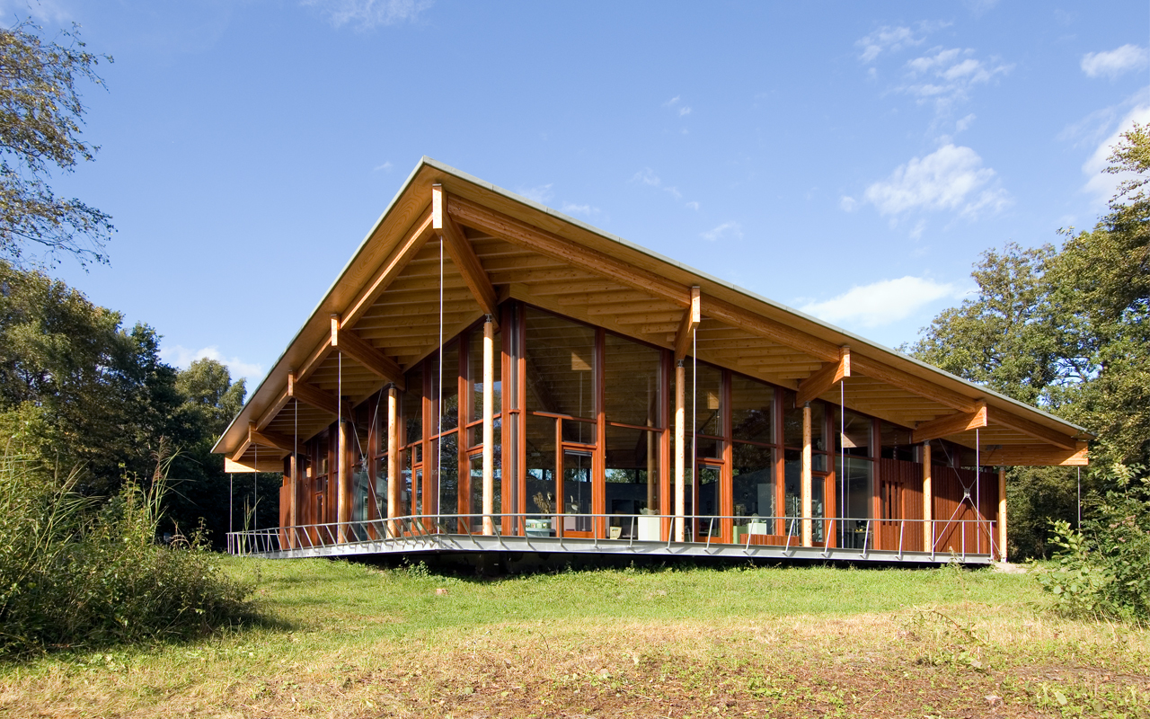 The structure of the building is built out of timber columns and beams, with large roofoverhangs. From the veranda visitors can admire the view towards the orchid garden and the dune lake. The veranda is suspended from the timber beams that protrude from the elevations. The roof is suspended from the facades by a glass strip and looks like it is floating.