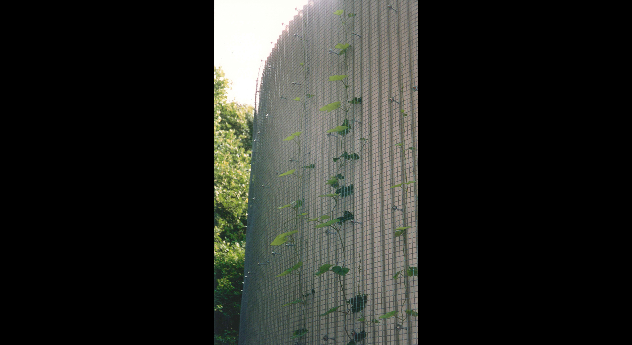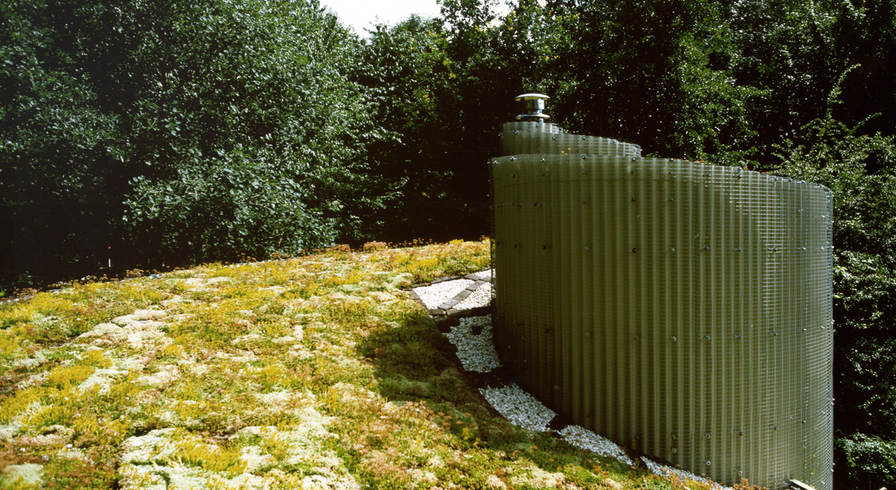 The chimney and installations are located at the heart of the shell. Succulent plants cover the roof  and a steel net is projected over the corrugated sheets which make out the facades. Over time the building will be overgrown with all sorts of climbing plants and as a result naturally integrated within the green environment.